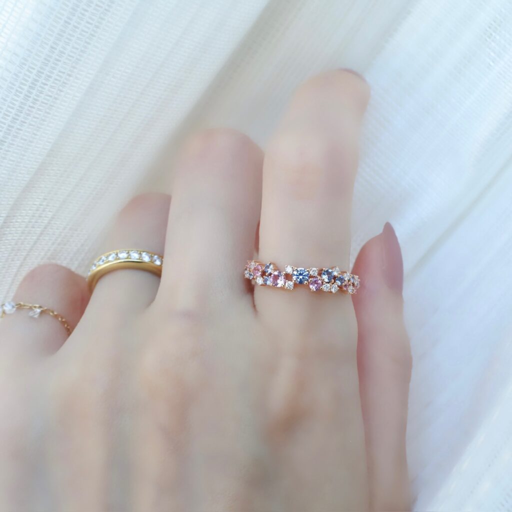 四つの爪で留めたサファイアが集まると、まるで花冠のような可愛らしさ!