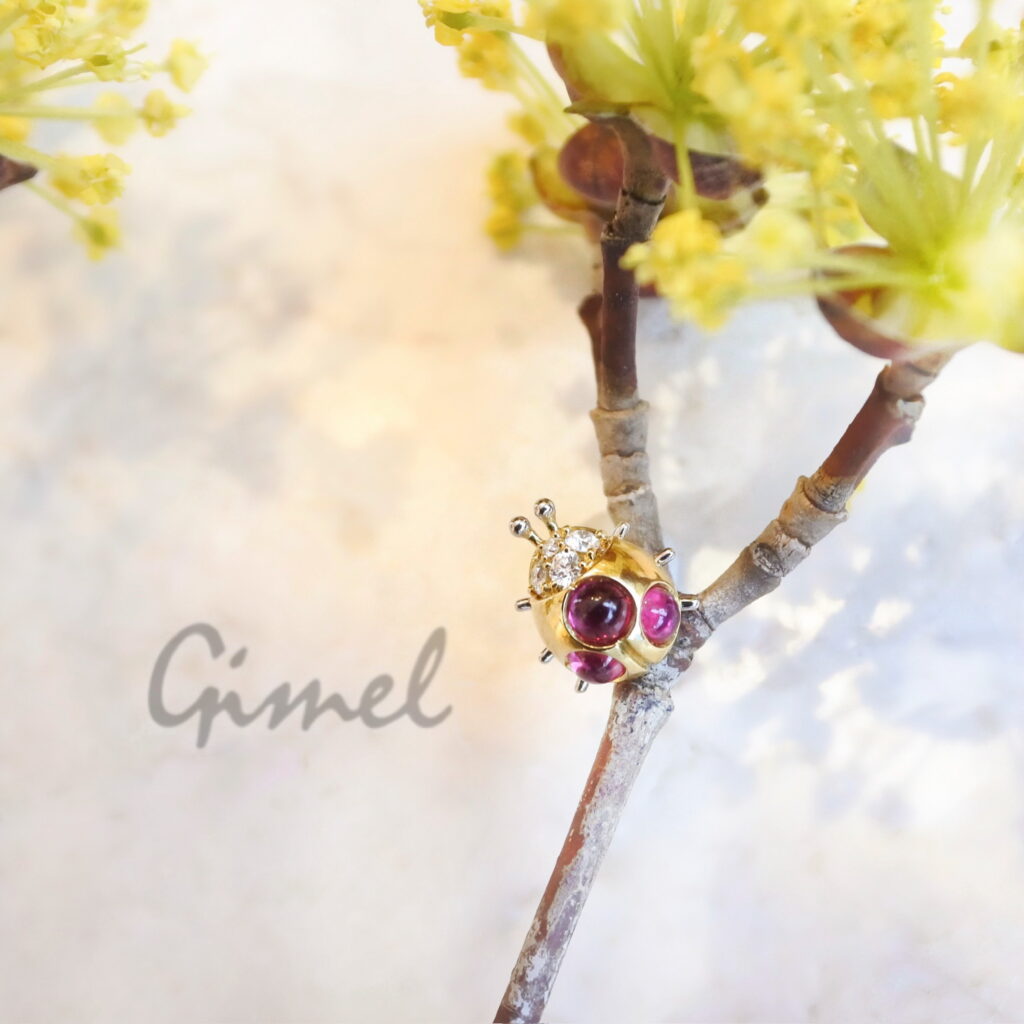 特徴的な斑点は、カボションカットを施したルビー。つやっとした輝きが美しいです。