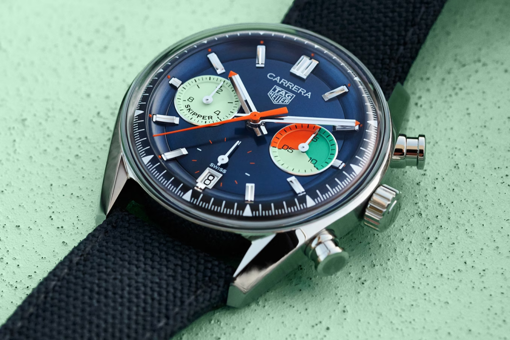 シグネチャー カレラ ブルーのダイヤルの3時位置と9時位置には、明るいティールカラーのカウンターが配されています。1968年の初のスキッパーウォッチにインスピレーションを与えたアメリカズカップの船、イントレピッド号のデッキを思い起こさせるデザインです。スタイルと機能をパーフェクトに融合したウォッチです。