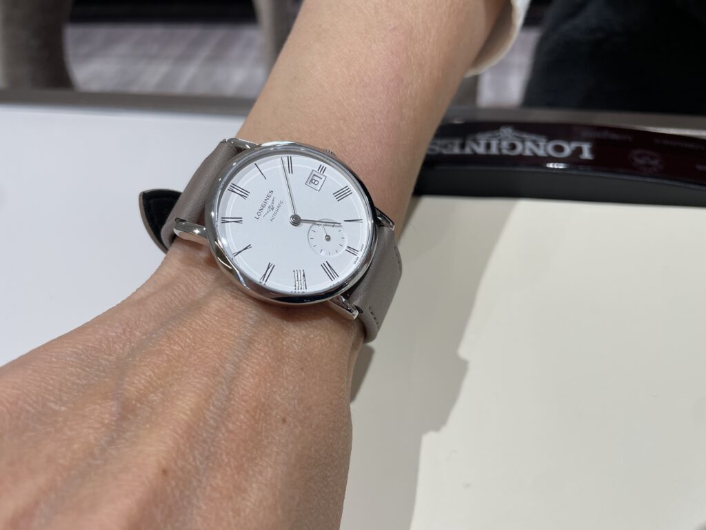 シンプルで見やすくスッキリとしているのでお仕事でもプライベートでも非常に使用しやすい1本となっております☺️お客様は少しケース径が大きいものがお好みでしたのでピッタリですね!そしてとてもよくお似合いでした🫶他のシリーズも何点かご覧いただきましたがデザインは好みだけど少し大きかったりしたので、このエレガントコレクションが1番グッときたのではないでしょうか?🥰🫶