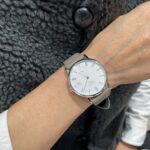 サンレイ加工サテン仕上げを施したシルバーダイヤルには、18K 5N ローズゴールドプレートの数字、針、フランジでアクセントがつけられ、洗練されたあたたかみのあるコントラストですね☺️☺️中央6時位置には、手の込んだマーキングで縁取りされたシルバーのムーンフェイズディスクが配され、月の満ち欠けを表示します。
