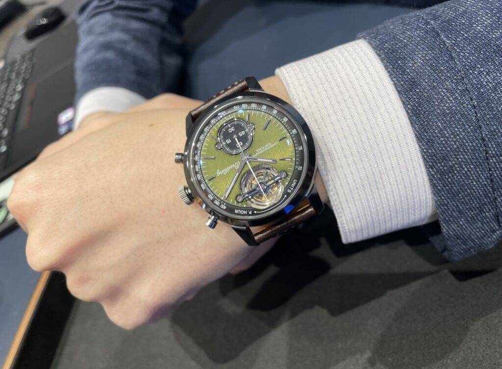 従来にはない落ち着いたトーンのグリーンは、自由を謳歌する60年代―70年代の名車達から着想を得たものだそうです!ボンネットから覗くエンジンさながらに、12時位置に鎮座するトゥールビヨンが無類の存在感を放っていますよね👀✨✨ぜひお手にとってみてくださいね!