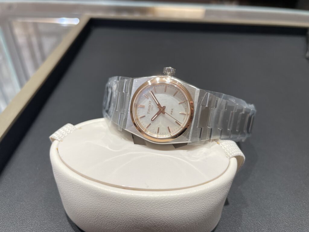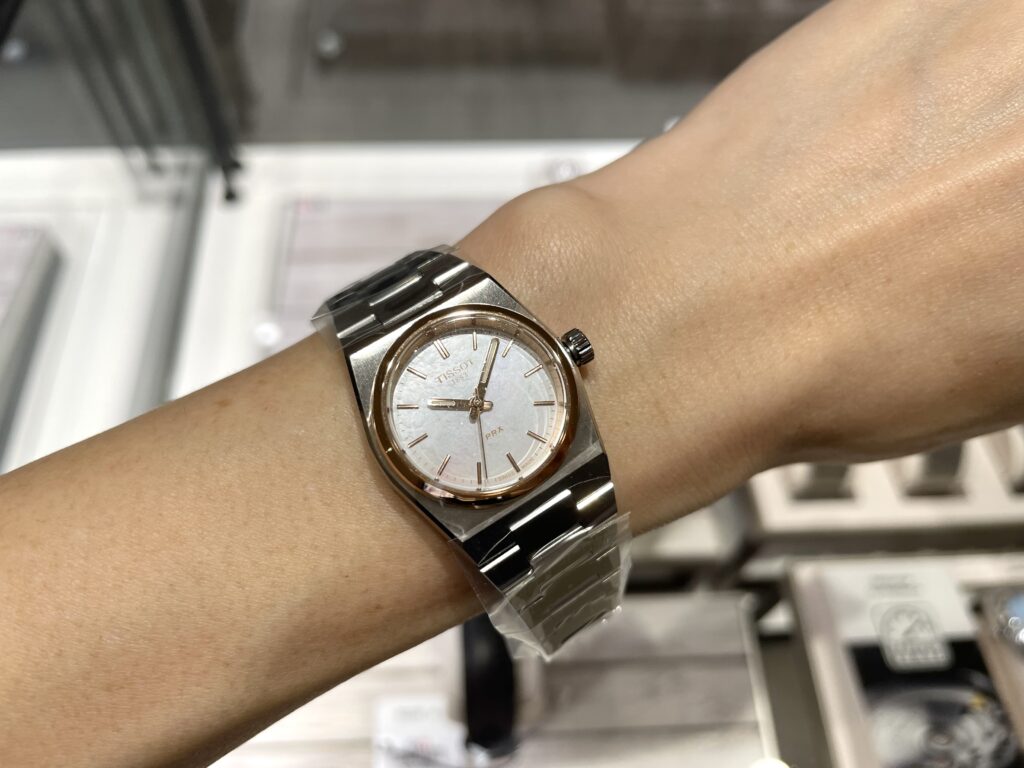 可愛い〜!!PRXはなんだかスポーティなイメージを持たれる方もいらっしゃるかと思いますがこの25mmは華奢で優しい印象を持ちますね😉文字盤のシェルも立体感があり、高級感も増します🙌こちらのPRXは他にもカラーを展開しておりますのでぜひ店頭でご試着してみてくださいね!