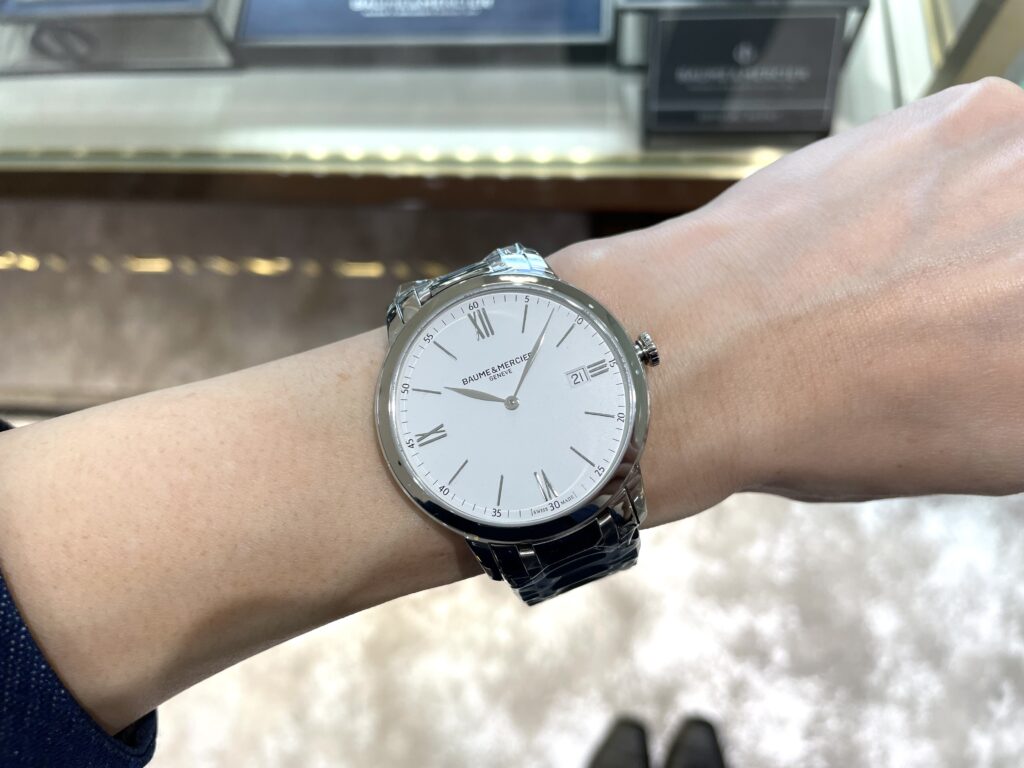 少し私には大きめですが圧倒的な見やすさ!そしてスッキリとしておりどんな方にも似合うこのデザイン😇👏ぜひ一度店頭でご試着してみていただきたいです。ボームアンドメルシエにも20万円台でこんな素敵な時計がご用意できるんです☺️✨はじめての時計にも使いやすいですし、何本もお持ちの方でもビジネスライクな1本増やしてみるのも良いですよね〜💁♀️ぜひ店頭でご覧くださいね!お待ちしております😊