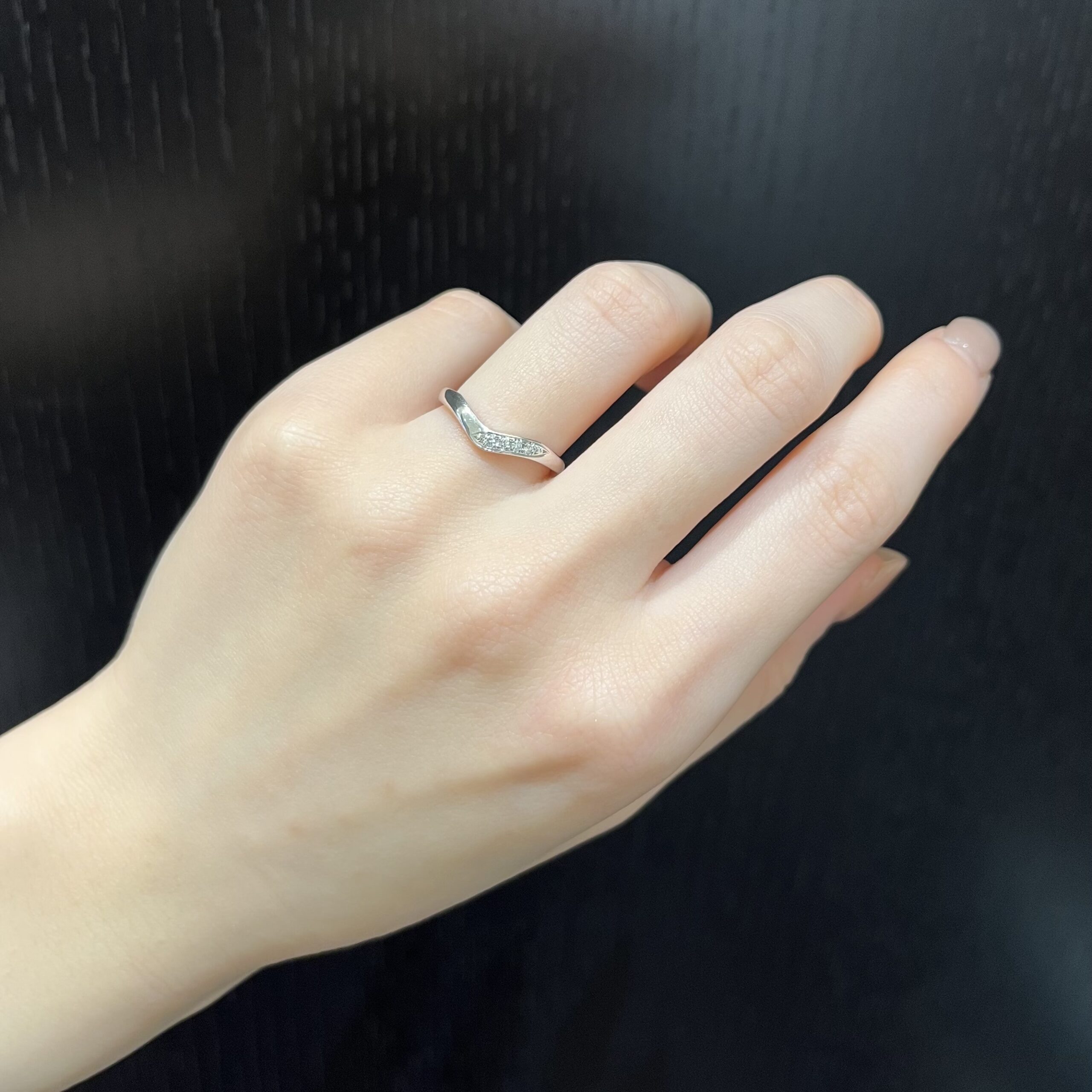 ミキモトのリングはゆるやかな曲線を描いていて、シャープな印象もありながら優しい雰囲気も感じられます。