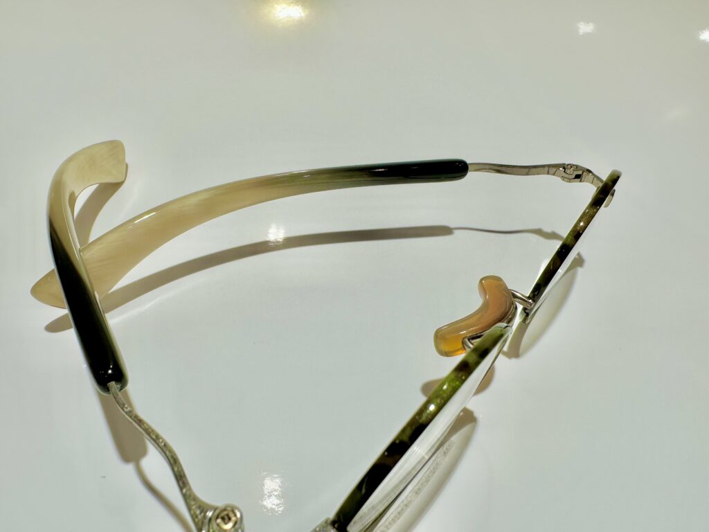 天然素材のバッファローホーンをテンプル部分に使用しており、肌へのあたりの柔らかさを感じられます。