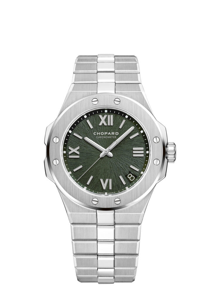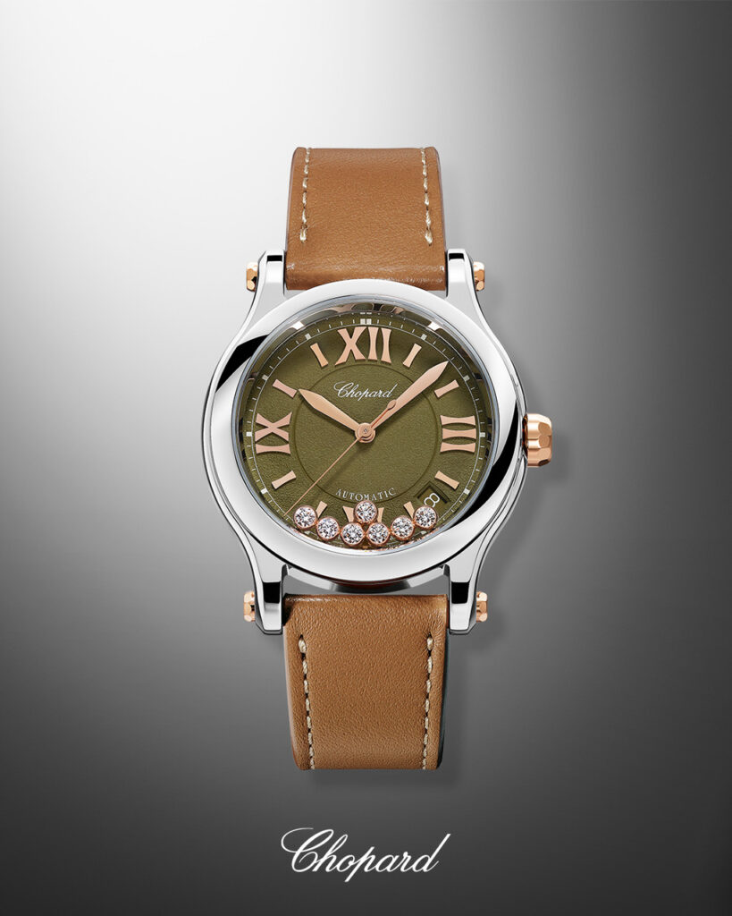 ハッピースポーツはショパールの主力コレクションです。文字盤上2枚のサファイヤクリスタルの間をダイヤモンドが動く遊び心溢れた代表作です。こちらは2025年新作、カーキグリーン文字盤が特徴なハッピースポーツ最新モデルです。