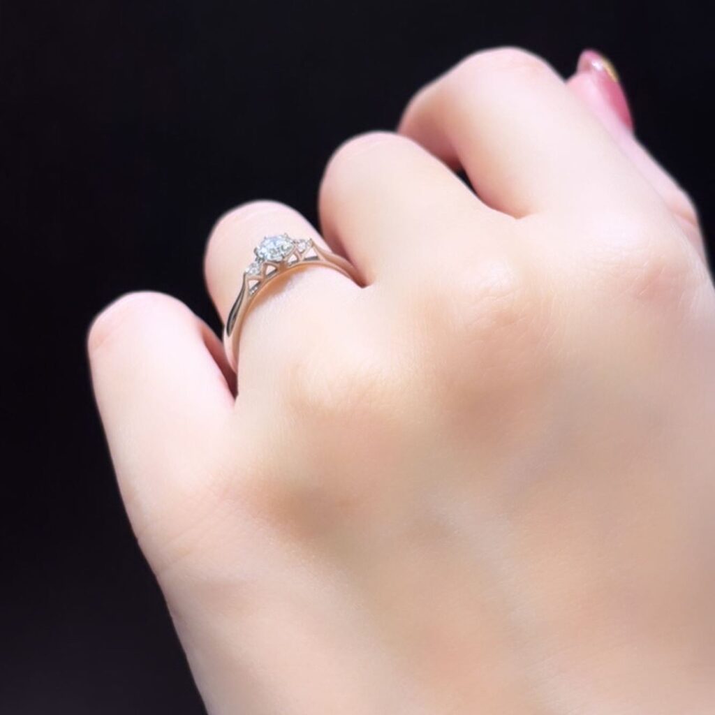 センターストーンの両サイドにメレダイヤがセッティングされた、シンプルでありながらも華やかさを添えるデザイン。
