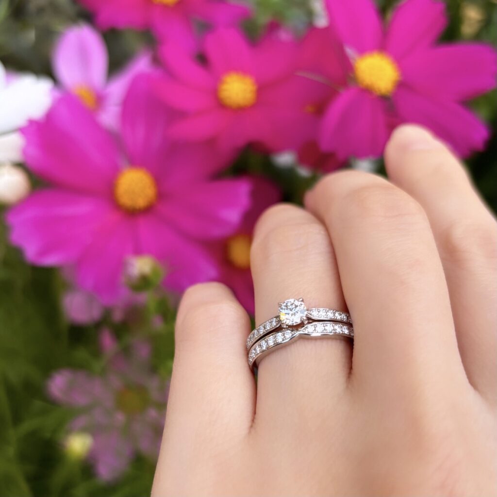 写真のようにマリッジリングWITH〜ウィズ〜(PJ040PRL)と一緒に着用してみると、ピタッと統一感が出る重ね着けもでき、装いやお出かけする場所に合わせて着け方を変えてコーディネートを楽しむこともできます。