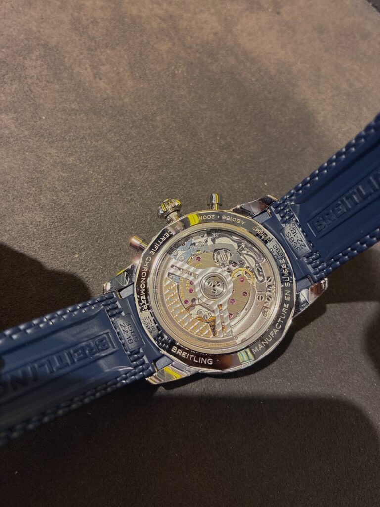 ブライトリングが誇る自社製ムーブメント「キャリバー01」を搭載しており、ケースバックからご覧いただくことができます。