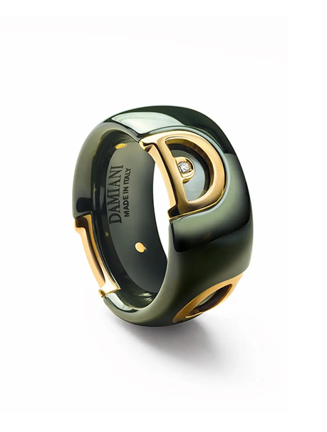 ヴェルデ・ボスコは“森林の緑”を意味し、ダークグリーンのセラミックとイエローゴールドのディテールを持つ2つのリングとネックレスの展開です。