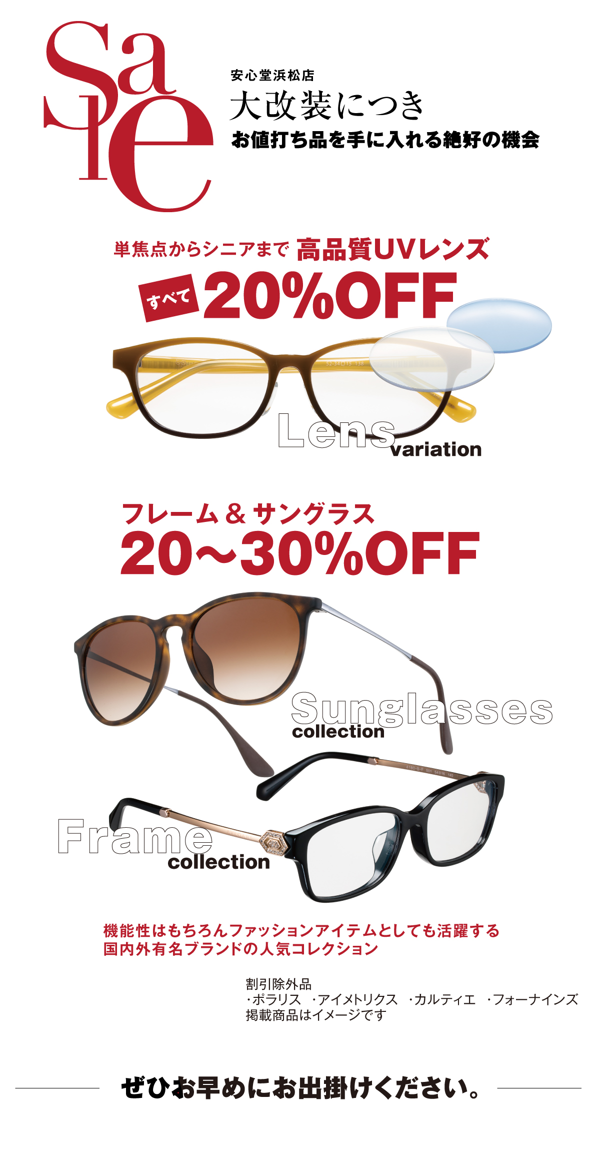 案心堂浜松店 大改装につき お値打ち品を手にいれる格好の機会 単焦点からシニアまで 高品質UVレンズ すべて20%OFF フレーム&サングラス 20〜30%OFF 機能性はもちろんファッションアイテムとしても活躍する国内外有名ブランドの人気コレクション 割引除外品・ポラリス・アイメトリクス・カルティエ・フォーナインズ 掲載商品はイメージです