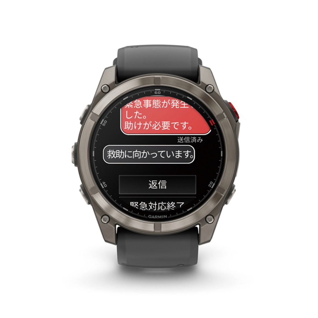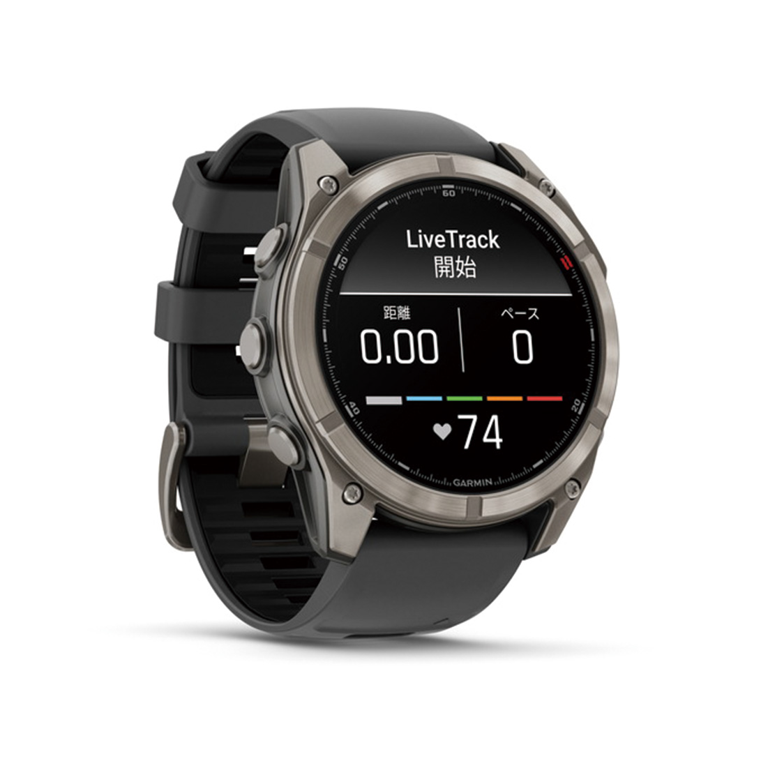 ストラップ素材:シリコン / レンズ素材:サファイアクリスタル / ベゼル素材:チタン / ケース素材:繊維強化ポリマー(チタンリアカバー) / サイズ:51×51×16.5mm / ディスプレイサイズ:直径1.4インチ(35.56mm) / 稼働時間*スマートウォッチモード:約27日間(常時表示:15日間) / 内蔵メモリ/履歴:32GB / 防水等級:10ATM |
